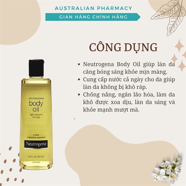 - Dầu dưỡng thể Neutrogena Body Oil Light Sesame Formula giúp cung cấp nước cho da, giúp làn da không bị khô ráp mà luôn căng bóng, sáng khỏe tự nhiên