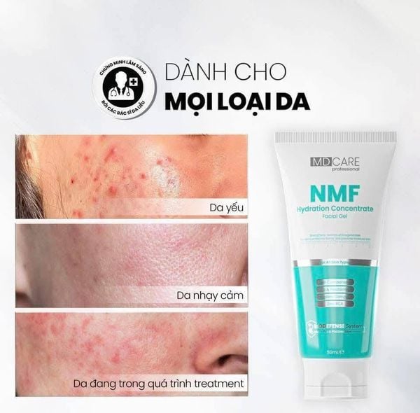- MD CARE NMF Hydration Concentrate Facial Gel hỗ trợ phục hồi làn da yếu, da sau mụn, da bị kích ứng nhờ vào các thành phần phục hồi như Allantoin, Panthenol và các chiết xuất thiên nhiên dịu nhẹ. Tăng cường khả năng tái tạo tế bào mới, thúc đẩy làm sáng và đều màu da theo thời gian.