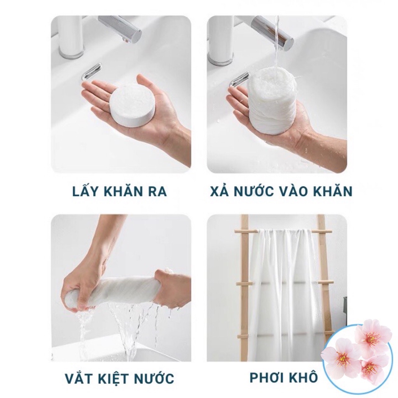 🔸 Cách sử dụng đơn giản: mở bao bì bên ngoài, cho khăn vào nước khăn sẽ nở ra và sẵn sàng để sử dụng, dùng 1 lần.