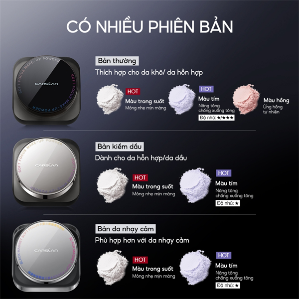 Phấn Phủ Dạng Bột, Kiềm Dầu Carslan Soft Focus Make-up Powder hiện có các tone màu như sau: