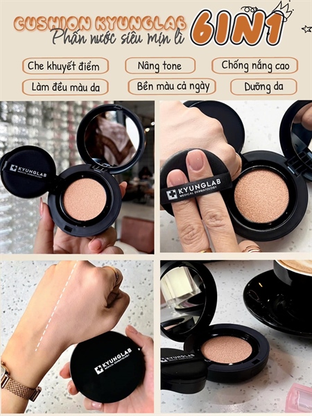 Ngay từ khi ra mắt, không chỉ gây ấn tượng với thiết kế sang trọng và thanh lịch, Cushion KyungLab còn sở hữu khả năng thay đổi rõ rệt làn da mộc trong tích tắc với lớp nền mỏng nhẹ cùng độ che phủ tuyệt vời và cực kì bền màu, lâu xuống tone. Không chỉ tạo hiệu ứng trong veo, che phủ cao giúp che mờ khuyết điểm, làm đều màu da chỉ trong tích tắc cho làn da rạng rỡ suốt cả ngày!