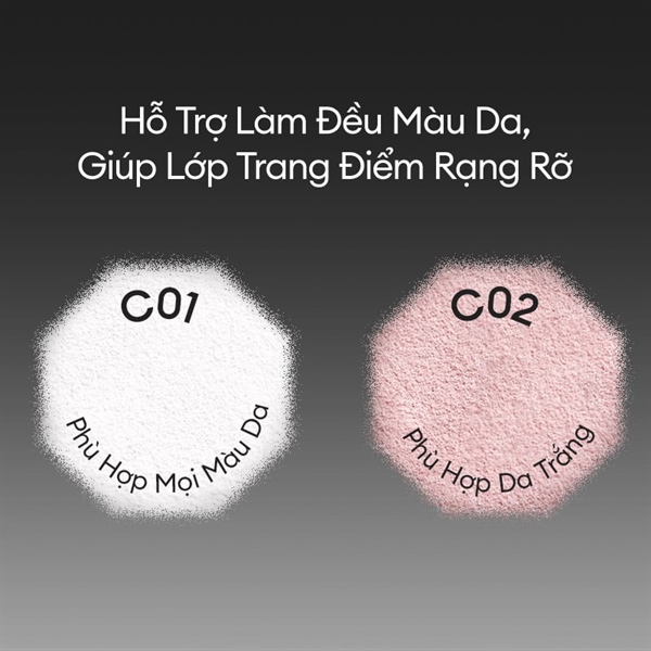 C01: Phấn phủ màu trắng - giúp hỗ trợ làm sáng và đều màu da, phù hợp cho mọi loại da