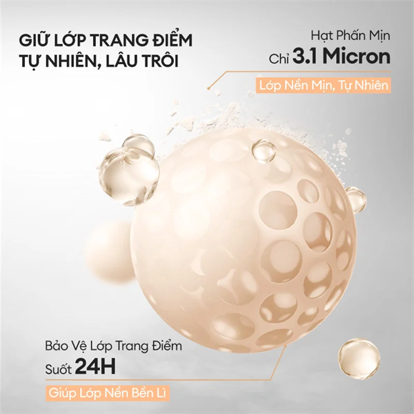 - Chất phấn siêu mịn: Với hạt phấn mịn màng chỉ 3.1 micro cùng công nghệ phủ mờ đặc biệt cho lớp nền mỏng nhẹ tự nhiên. Chất phấn có độ bám dinh tốt, không gây tình trạng vón cục.