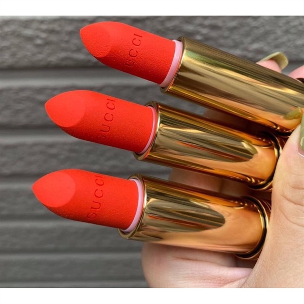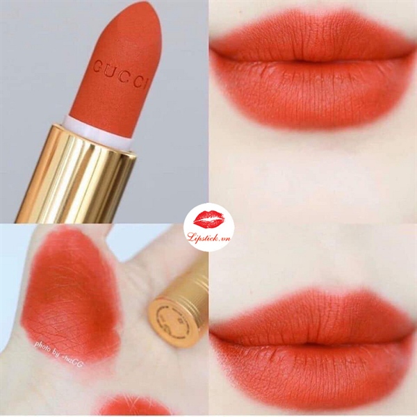 - Son Gucci 302 Agatha OrangeMatte thiết kế ấn tượng với tông vàng chủ đạo kết hợp hoa văn đầy tinh tế, sang trọng.