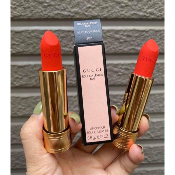 - Son Gucci 302 Agatha Orange là một màu mới nhất của hãng Gucci, là thỏi son có sự kết hợp của sắc cam tươi tắn, trẻ trung, năng động, đặc biệt phù hợp cho những cô gái có phong cách dễ thương, cổ điển. Cô nàng sở hữu làn da trắng sứ có thể tự tin diện màu son môi này mà không phải lo nghĩ nha.