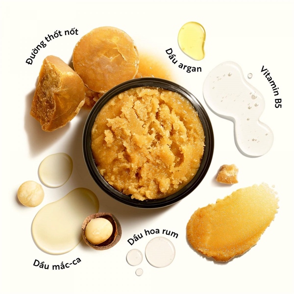 Thành phần: Sucrose, Borassus Flabellifer Sap, Aqua/Water, Panthenol, Carthamus Tinctorius (Safflower) Seed Oil, Macadamia Integrifolia Seed Oil, Argania Spinosa Kernel Oil, Cocos Nucifera (Coconut) Oil, Olea Europaea (Olive) Fruit Oil, Oryza Sativa (Rice) Bran Oil, Ethylhexylglycerin, Tocopherol, Magnesium Aluminum Silicate, Citrus Aurantium Dulcis (Orange) Peel Oil, Mentha Piperita Oil, Cymbopogon Citratus Leaf Oil, Parfum, BHT, Caramel, Phenoxyethanol.