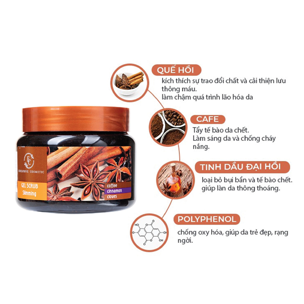 Tẩy Tế Bào Chết Eksklyuziv Kosmetik Quế Hồi Và Café được chiết xuất từ các thành phần tự nhiên với các hạt mát – xa li ti, kem tẩy da chết toàn thân quế hồi và cà phê của Nga giúp loại bỏ các tế bào chết, làm da tươi mới, mịn màng, cải thiện sự lưu thông máu.