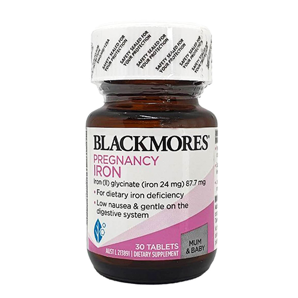 - Blackmores Pregnancy Iron bổ sung sắt với hàm lượng 24mg phù hợp với cơ thể của mẹ bầu, không xuất hiện các tình trạng táo bón, kích ứng dạ dày. Hơn nữa viên uống bổ sung sắt Blackmores không gây tác dụng phụ.