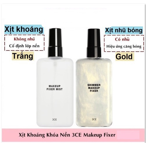 Chai Xịt 3CE Cố Định Lớp Trang Điểm 100ml là sản phẩm xịt khoá trang điểm đến từ thương hiệu trang điểm 3CE của Hàn Quốc, bên cạnh công dụng dưỡng ẩm, làm dịu da sản phẩm còn giúp giữ lớp nền bền vững, ngăn mồ hồi, dầu thừa đem lại làn da căng bóng tự nhiên và khoẻ mạnh. Đặc biệt sản phẩm có nhũ trắng nhẹ nhàng tạo lớp nền bắt sáng và lấp lánh.